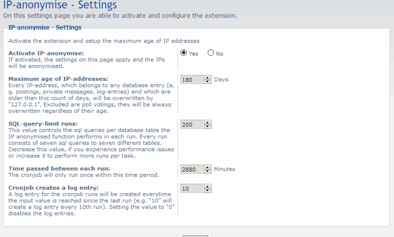此扩展将匿名化论坛中的所有 IP,这些 IP 永久存储在 phpBB 标准配置中。为了保护隐私,此扩展程序将用“127.0.0.1”覆盖这些IP。可以配置 IP 的年龄和 cronjob 的性能。