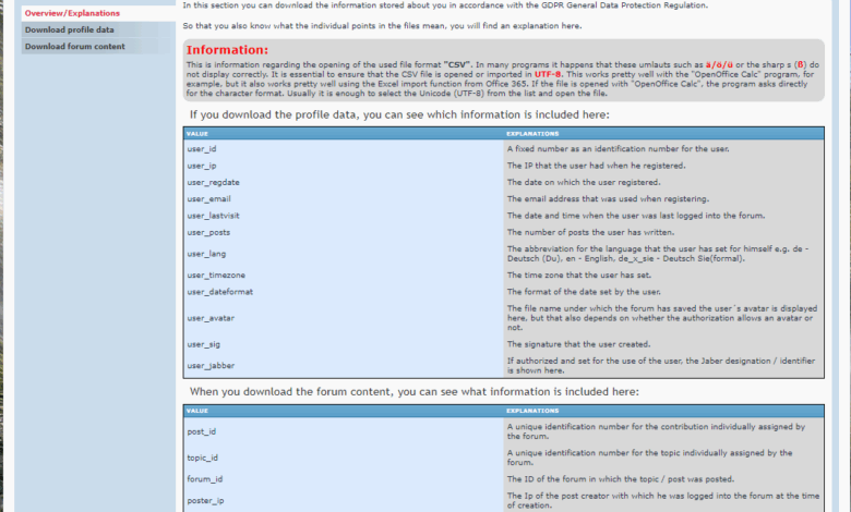 该扩展在个人区域创建一个模块,用户可以在其中下载存储在论坛中的有关他的个人数据。