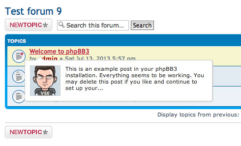 Topic Preview在工具提示中显示第一个帖子的简短文本摘要,同时将鼠标悬停在主题的标题上。它支持显示用户头像,最后一个帖子的文本,是高度可定制的,并带有多个主题。