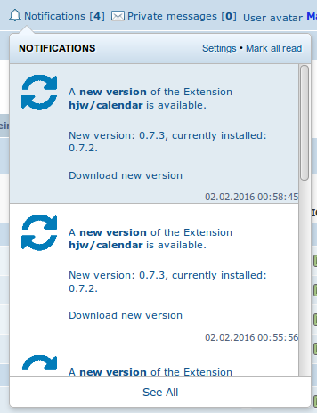 只有能够管理扩展或被允许检查phpBB更新的管理员才会收到通知。他们可以在UCP中单独管理他们的通知(启用/禁用电子邮件等)(Board首选项 -> 编辑通知选项)。